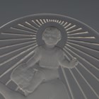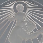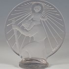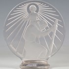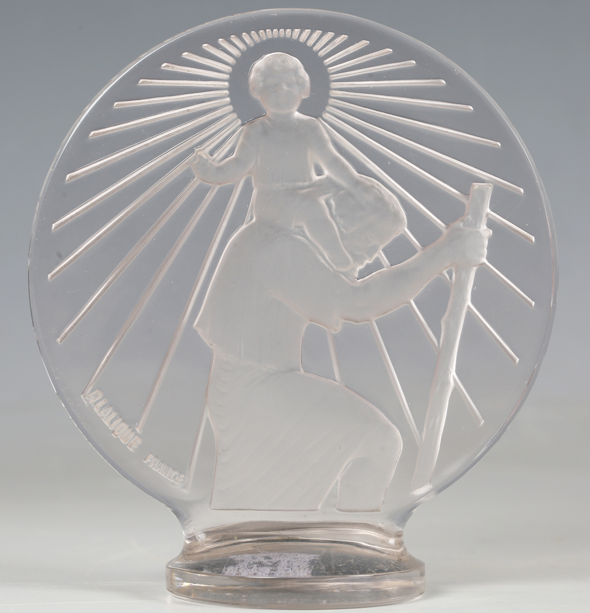 A Lalique moulded glass 'St. Christopher' car mascot, model No. 1142, introduced in 1928, moulded 'R. Lalique France', raised on a circular base, height 11.5cm (professional repair to edge of base).