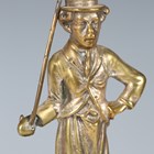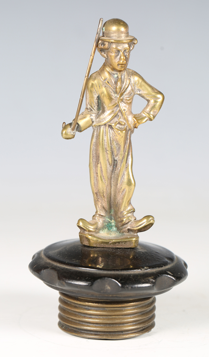 An early 20th century British cast brass 'Charlie Chaplin' car mascot, mounted to a radiator cap, total height 15cm. Note: an example of this mascot can be seen on page 21 in 'Accessory Mascots' by Dan Smith.