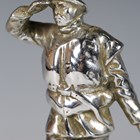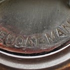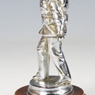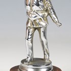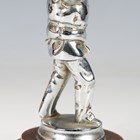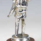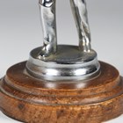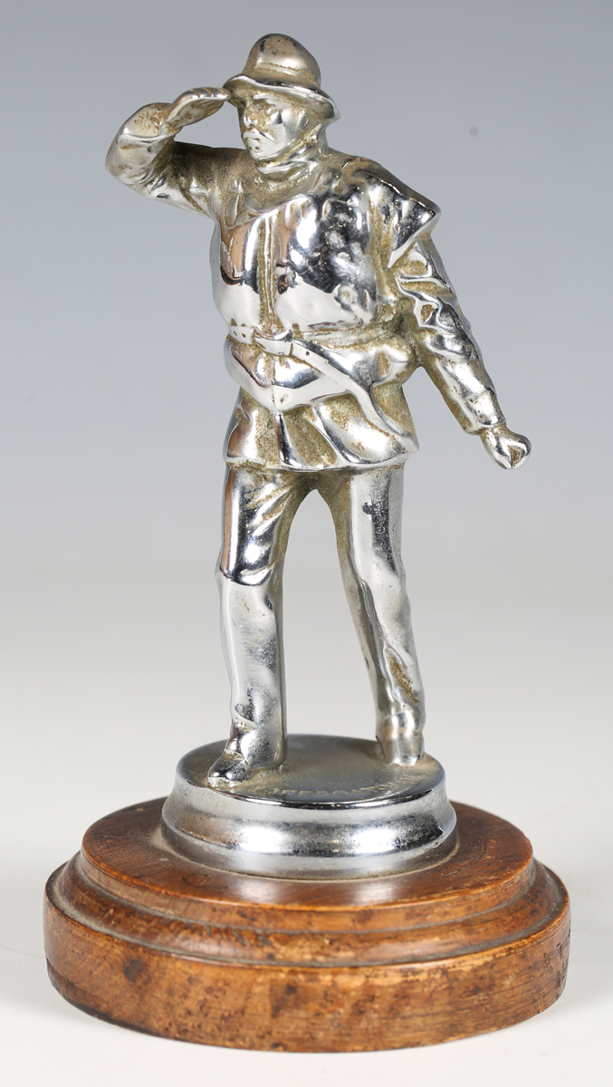 An early/mid-20th century chromium plated cast metal figural car mascot, titled 'Lifeboat-Man' to base, mounted on a wooden plinth, total height 15.5cm.
