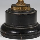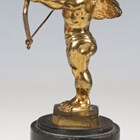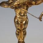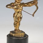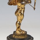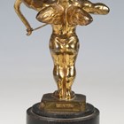 An early 20th century British gilt metal 'Dinkie Doo' car mascot, cast in the form of a muscular cherub holding a bow and arrow, height 13cm, raised on an ebonized wooden plinth.