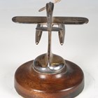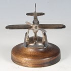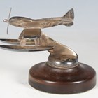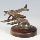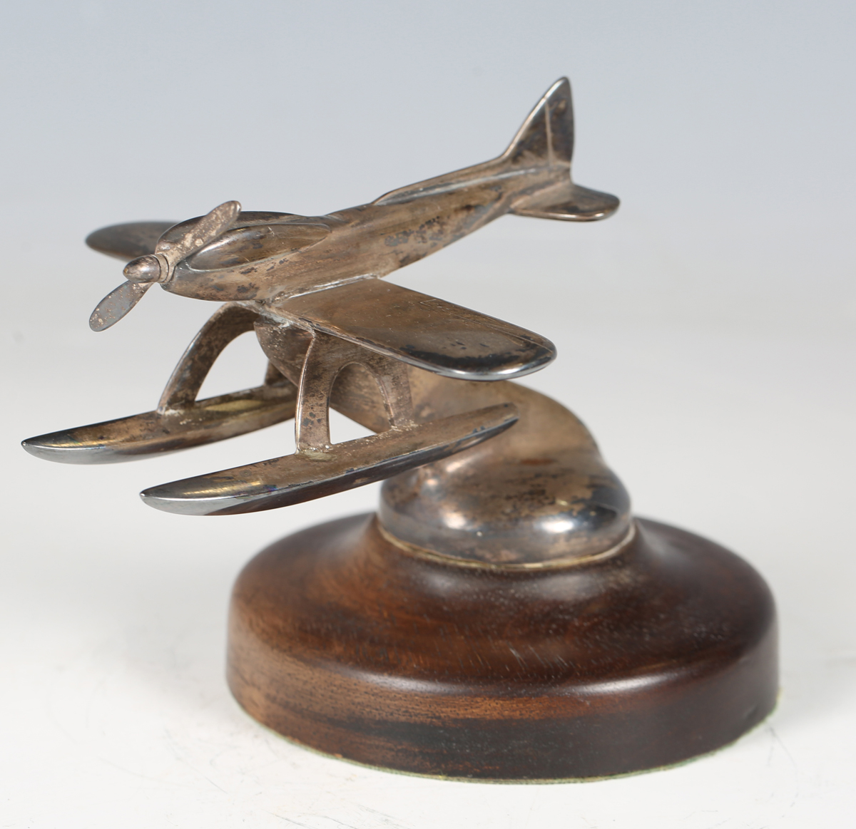 A silver plated cast metal Schneider Trophy seaplane replica car mascot, mounted on a wooden plinth, height 12cm.