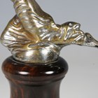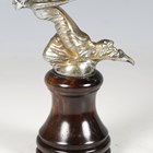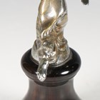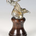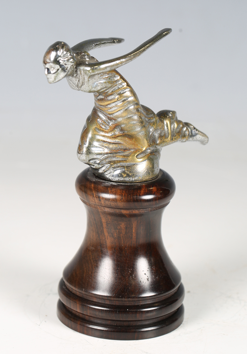 An early 20th century nickel plated cast bronze figural 'Speed Nymph' car mascot, in the manner of A.E. Lejeune, height 7cm, mounted to a turned coromandel plinth.