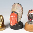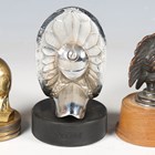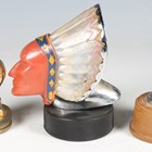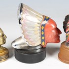 An early 20th century cast brass car mascot in the form of the head of a Native American, mounted to a radiator cap, height 8cm, another enamelled cast bronze mascot in the form of a chief's head, probably made for Guy Motors, height 7.5cm, and a similar mascot, detailed 'Blackstone MFG. Co. Inc U.S.A Copyright 1960', raised on a rubber base, detailed 'Viceroy', height 13cm.