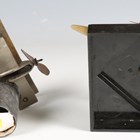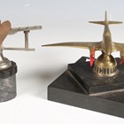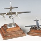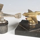 An early 20th century nickel plated brass car mascot in the form of a biplane, length 14.5cm, mounted to a radiator cap, together with three similar cast metal models of aeroplanes.