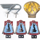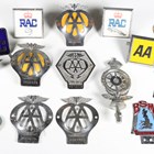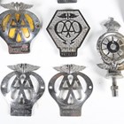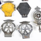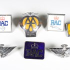 A group of car badges, including a commercial vehicle AA badge, three enamelled BSM National Club badges and various RAC badges.