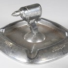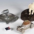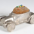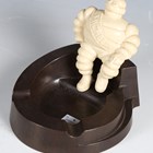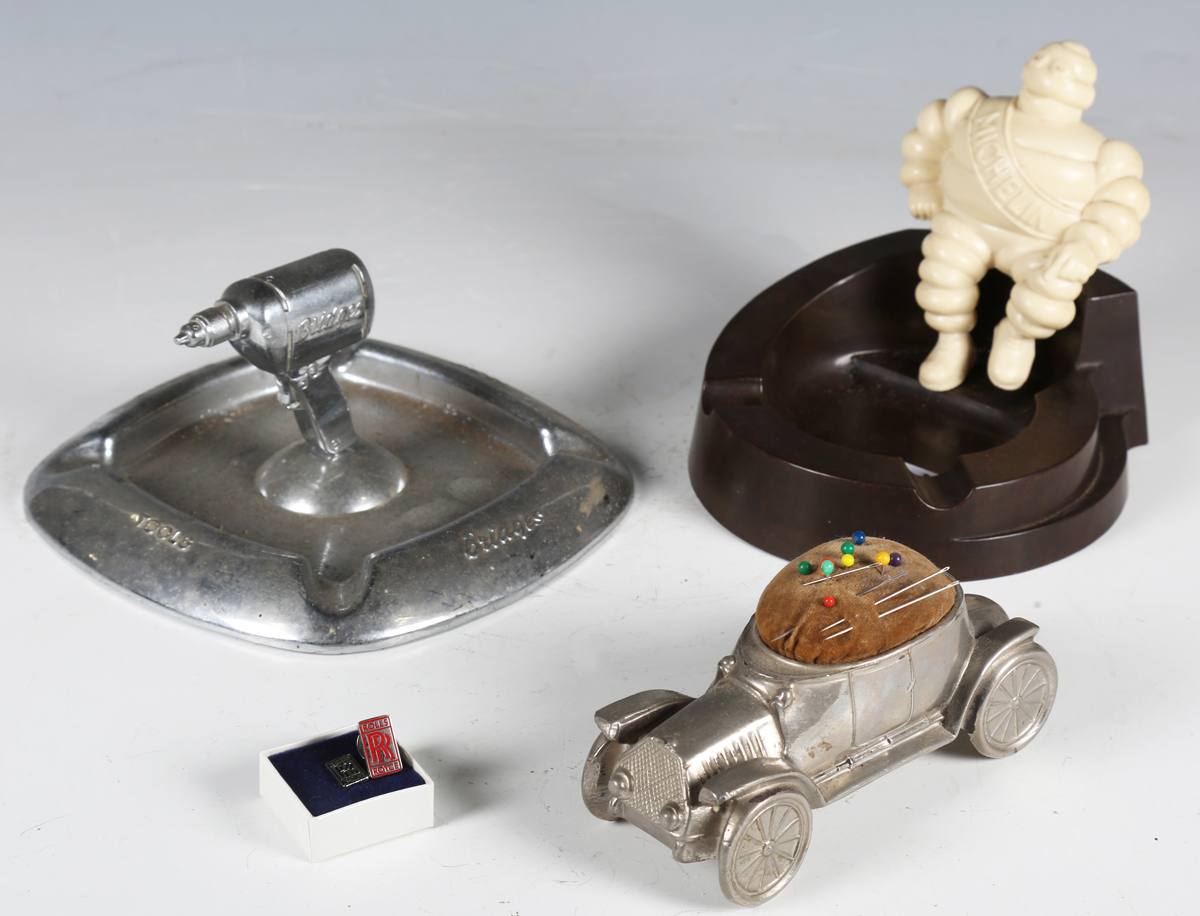 A Michelin rubber and Bakelite advertising ashtray with Mr Bibendum mount, height 12cm, together with a Bridges Tools advertising ashtray, two Rolls-Royce pin badges and a novelty pin cushion in the form of a vintage motor car, length 13cm.