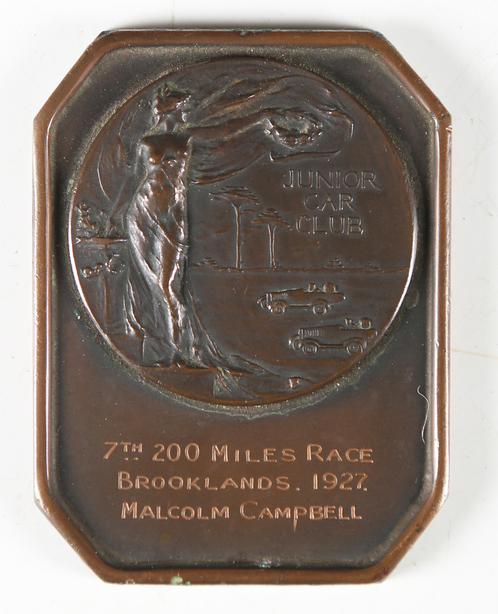 A Junior Car Club cast bronze winners plaque, inscribed '7th 200 Miles Race Brooklands. 1927 Malcolm Campbell', 6.2cm x 4.6cm. Note: Sir Malcolm Campbell, the legendary British racing car driver, won this race twice in 1927 and 1928.