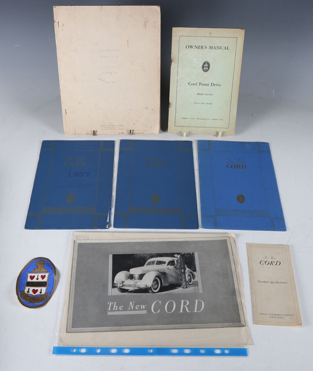 A collection of Cord related ephemera, including a 1936 Cord Model 810 Preliminary Parts List, a 1937 The New Cord sales brochure, two similar brochures and a Cord Front Drive Model 810-812 Owner's Manual.