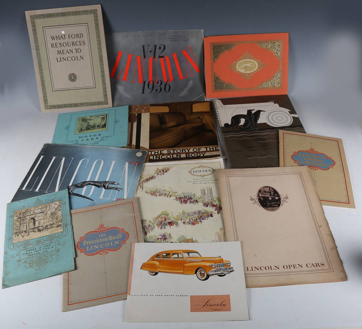 A French Lincoln V8 and V12 sales brochure, a group of other 1930s Lincoln sales brochures and a Lincoln Travelogue of Art and Transportation booklet.