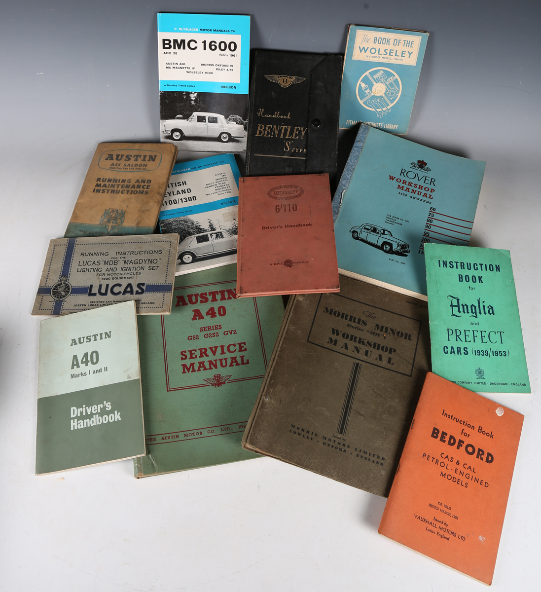 A Bentley 'S' Type handbook, a Wolseley 6'110 handbook, a Morris Minor Series 'MM' workshop manual and a collection of other manuals and handbooks.