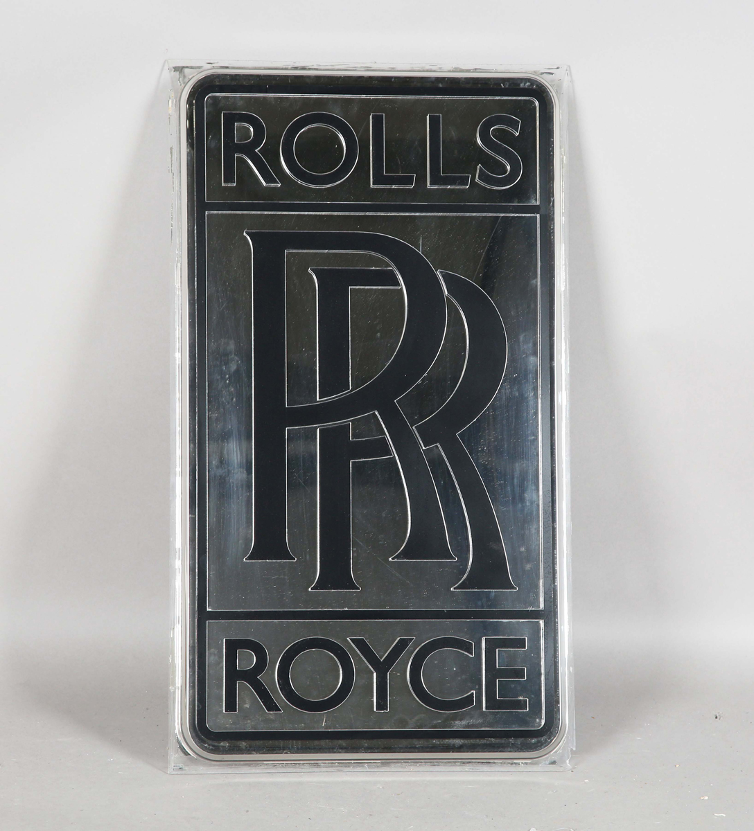 A modern Rolls-Royce mirrored and black plastic dealer's advertising sign, 71cm x 41cm.