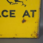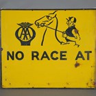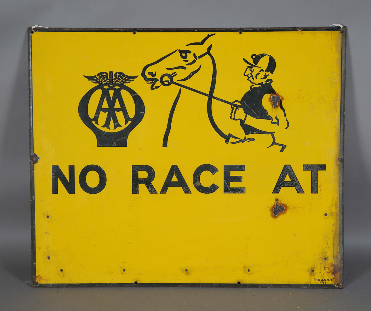 An AA 'No Race At' pictorial enamel sign, depicting a jockey on horseback, detailed 'Franco', 76cm x 91cm.