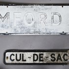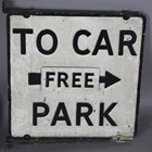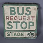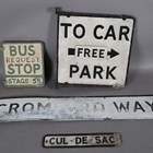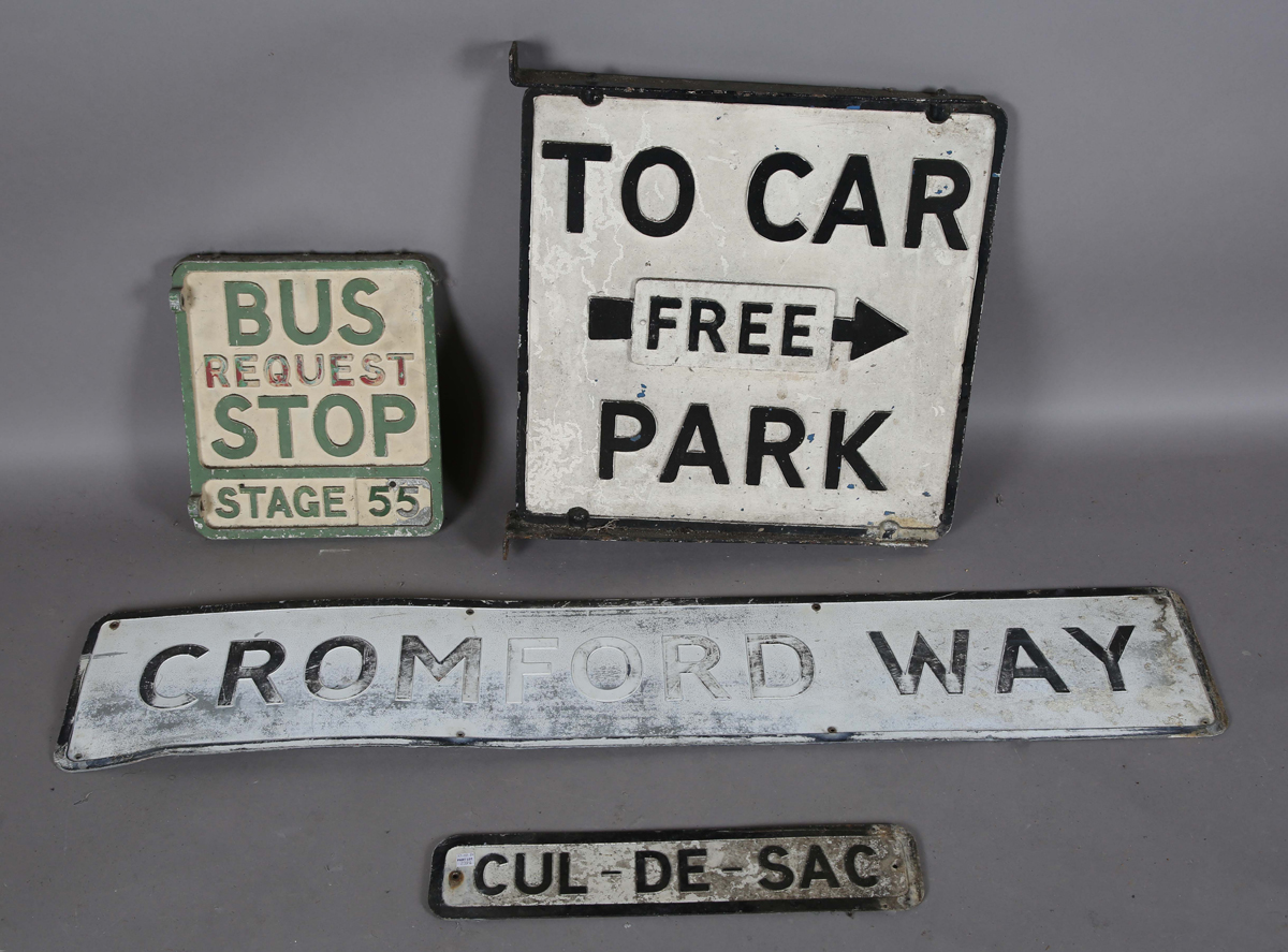 A cast alloy double-sided 'Free Car Park' directional sign, 60cm x 55cm, a similar painted cast alloy double-sided 'Bus Stop' sign, 35cm x 31cm, and two road signs.