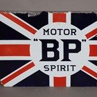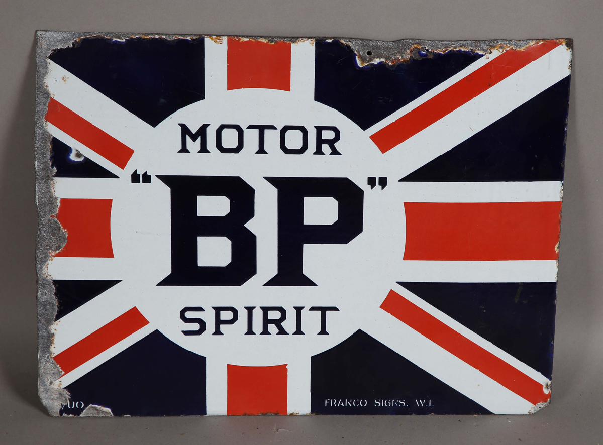 A BP 'Motor Spirit' double-sided enamel Union Jack design advertising sign, detailed 'Franco Signs', 40.5cm x 52.5cm (lacking flange).