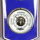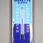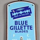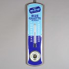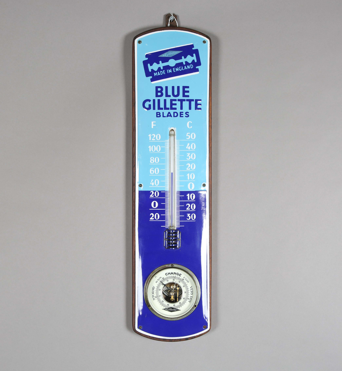 A good 'Blue Gillette Blades' enamel advertising wall thermometer and barometer, mounted to an oak backplate, 64cm x 16cm.