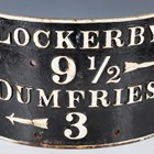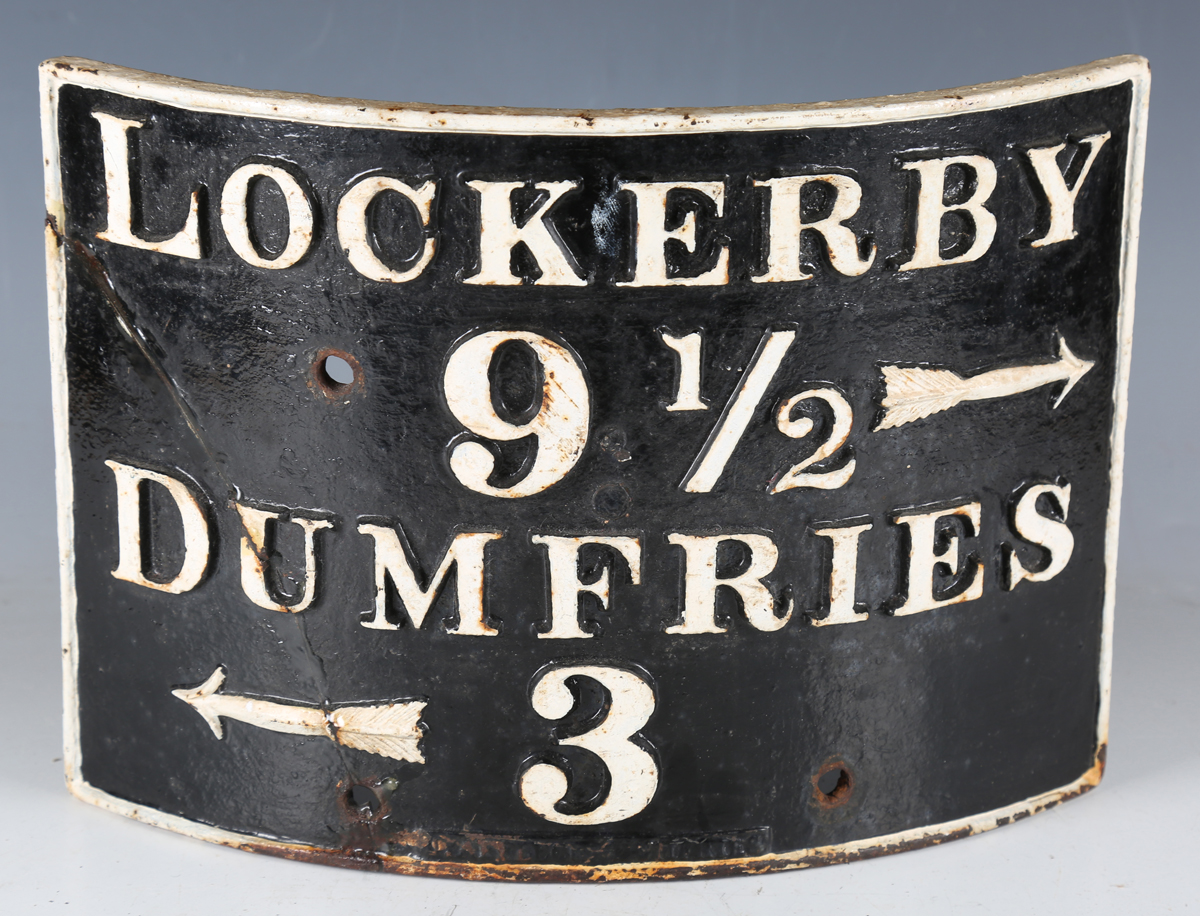 An early/mid-19th century black and white painted cast iron milestone marker, bearing foundry name 'J. Affleck Dumfries', possibly for use on the Caledonian Railway or roads, width 34.5cm (repaired corner).
