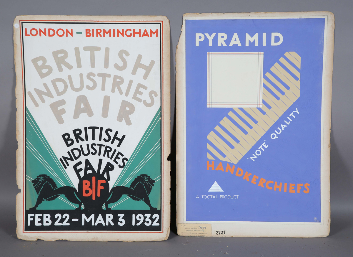 A group of three hand-painted poster designs for the 1932 British Industries Fair, 76cm x 51cm, later laid on board, together with a similar advertising poster design for Pyramid Handkerchiefs, dated 1932.