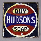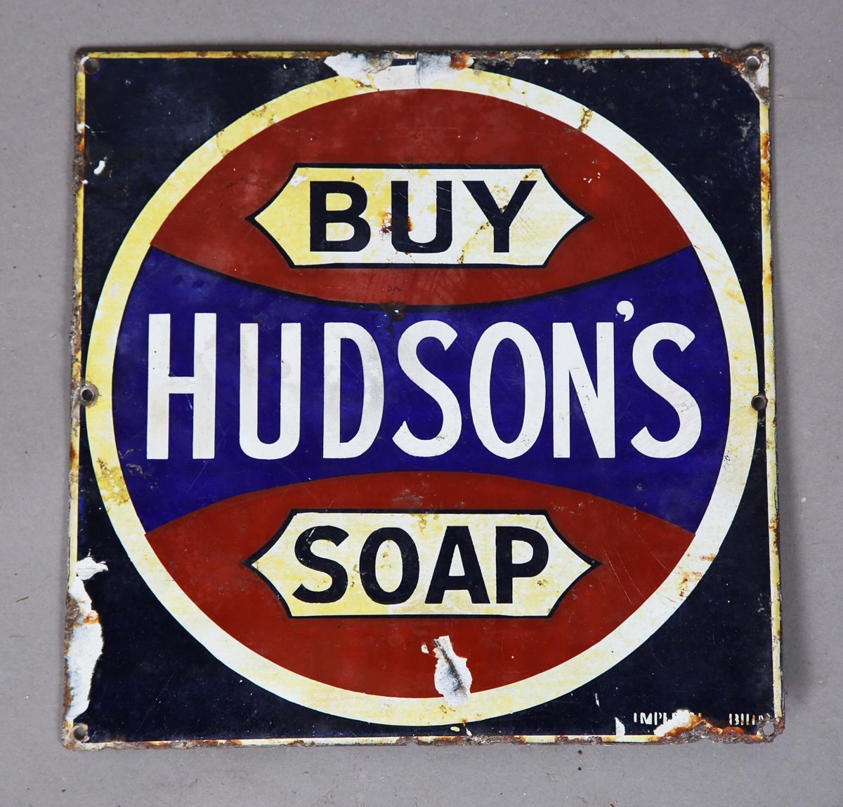 A 'Buy Hudson's Soap' enamel advertising sign, 26.5cm x 26.5cm.