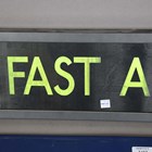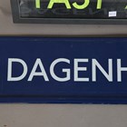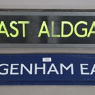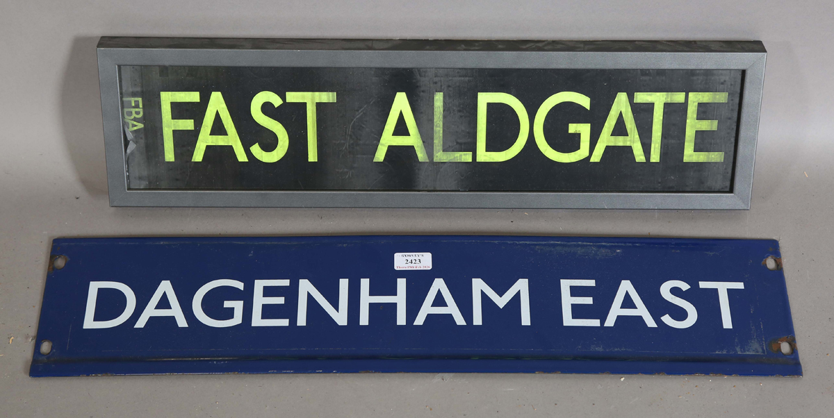 A London Transport enamel sign for 'Dagenham East', bearing 'Vintage Originals' label to reverse, 17cm x 74cm, together with another framed sign for 'Fast Aldgate', 17cm x 66cm.
