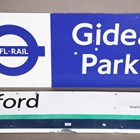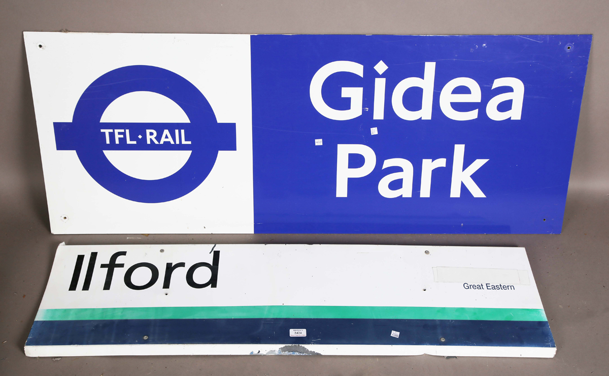 A London Transport plastic sign for 'Gidea Park' bearing 'Vintage Originals' label to reverse, 53cm x 135cm, together with a Great Eastern painted aluminium sign for 'Ilford', 33cm x 120cm.