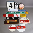 A collection of railway and transport signs, including a platform '2' sign, various warning signs and enamel signal arm panels.