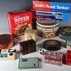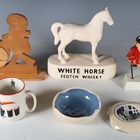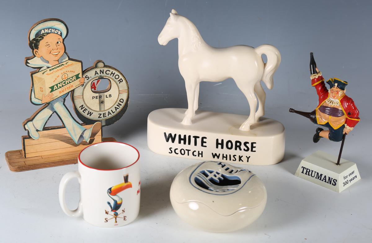 A White Horse Scotch Whisky ceramic advertising model, width 21cm, a Trumans Beer plastic advertising figure, a Philips radio ceramic advertising circular bowl and cover, an Anchor Butter advertising figure, a Guinness mug, an Esso petrol road tanker lorry and a collection of thirteen tins, including Huntley and Palmers, Rountree, Capstan, Quality Street and Oxo.