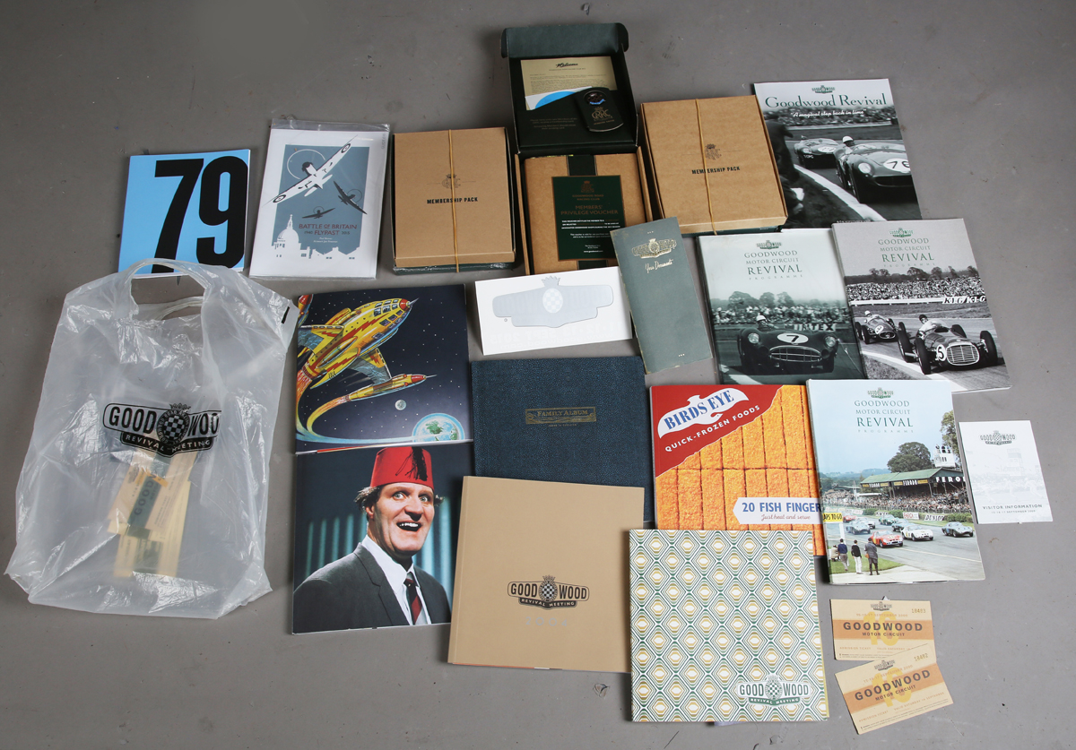 A group of Goodwood Revival memorabilia, including the inaugural 1998 programme, racecard and tickets, and nineteen GRRC membership packs for 2002-2015 and 2020-2024, including badges.