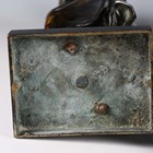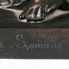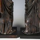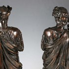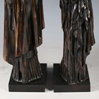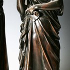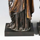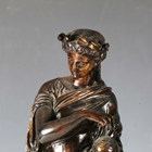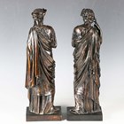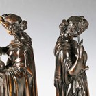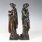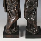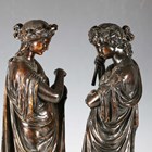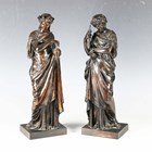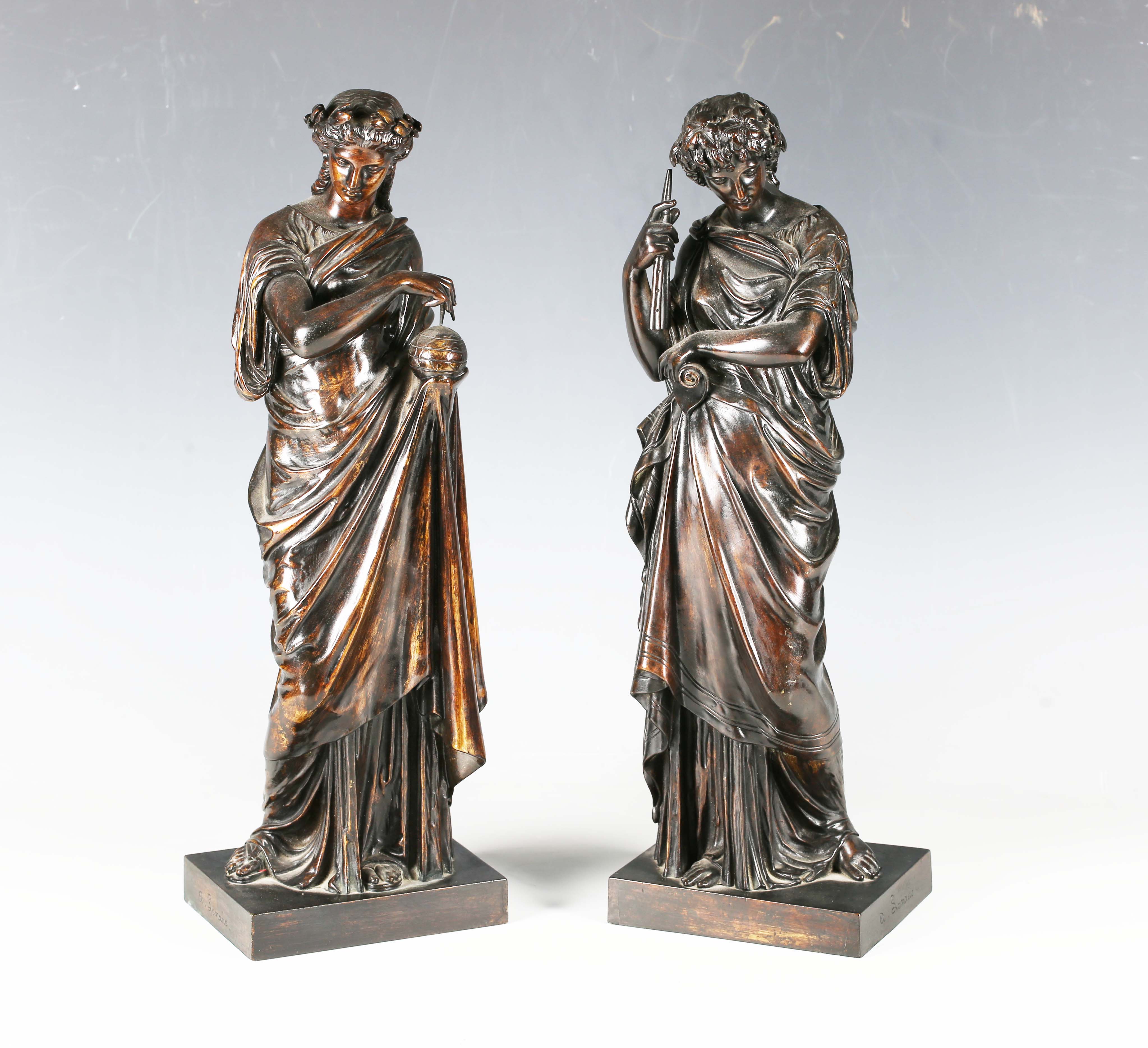 After Mathurin Moreau - a pair of 19th century French brown patinated cast bronze allegorical figures, one classical lady holding a globe, the other a sheet of music and two pipes, each bearing cast signature 'M.in Moreau' and 'A. Lemaire', height 40cm.