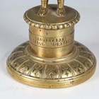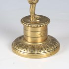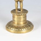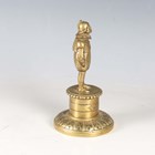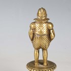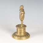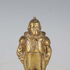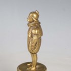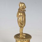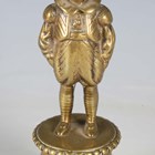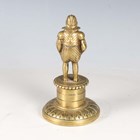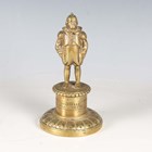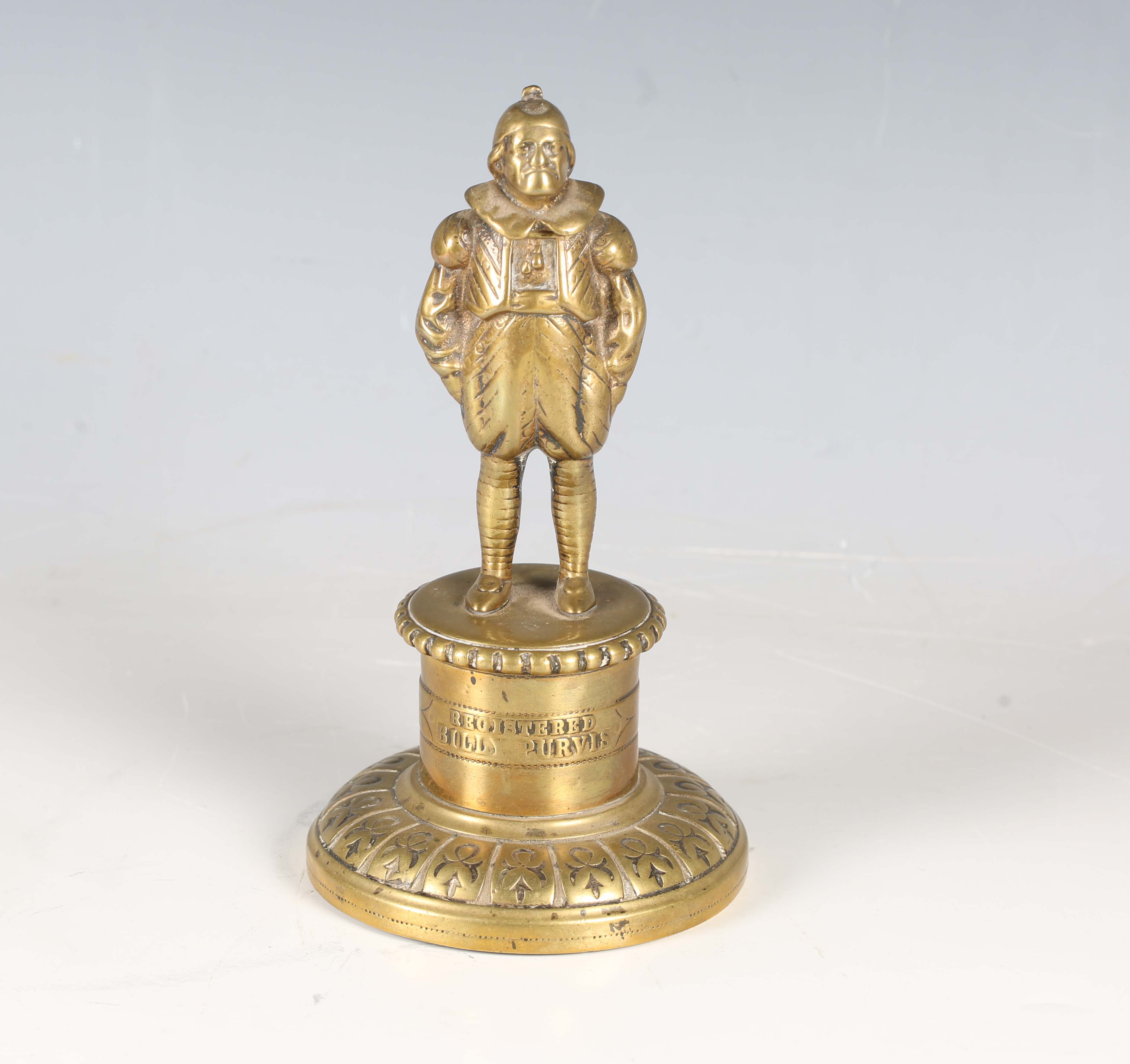 A late 19th century brass commemorative figure of Billy Purvis, a renowned Northumbrian showman, raised on an inscribed pedestal, height 19cm.