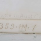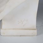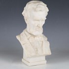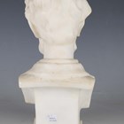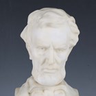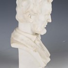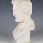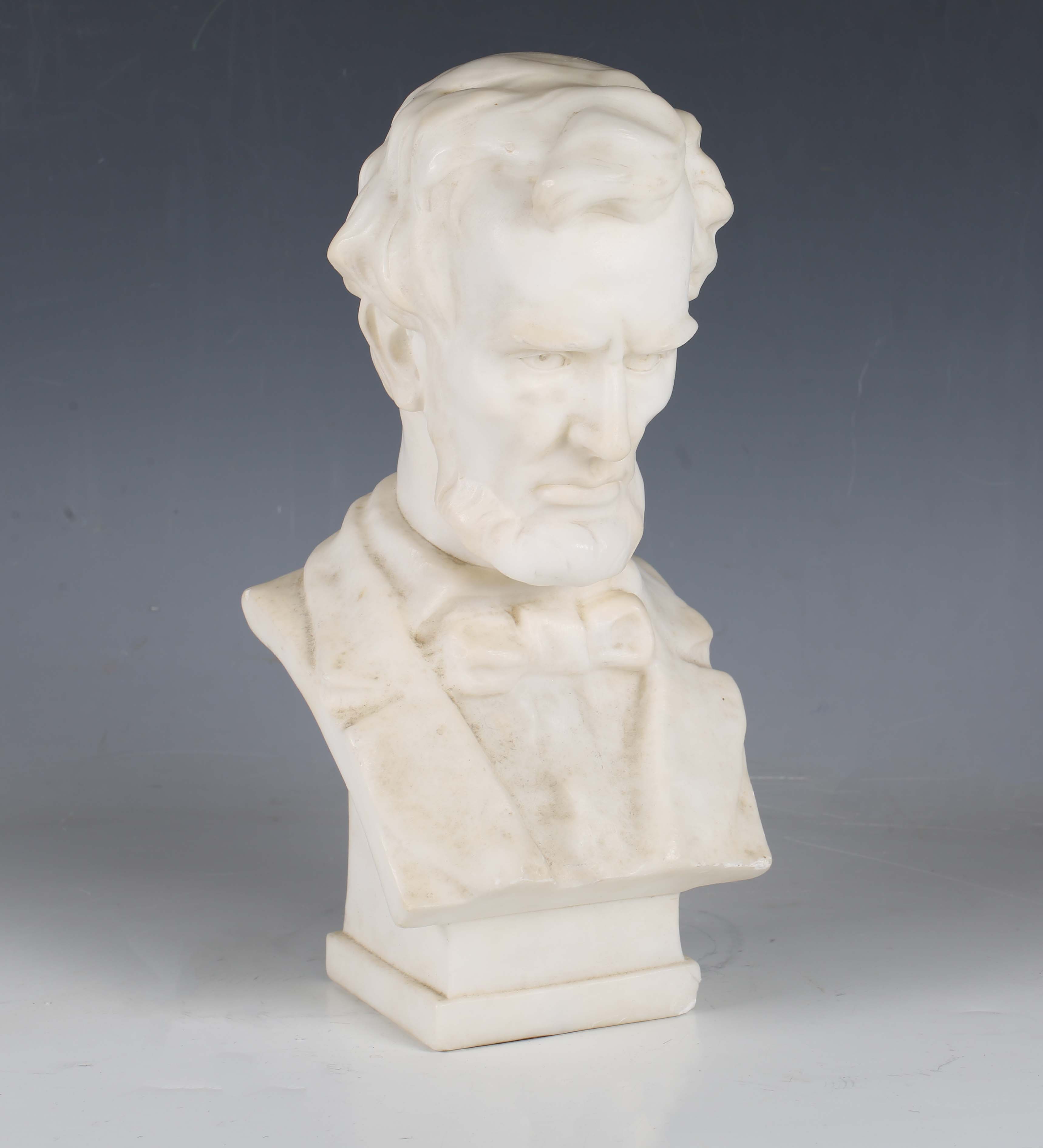 An Austrian white marble head and shoulders portrait bust of Abraham Lincoln, inscribed 'Scholz, Made in Austria 5359.HM.1' to base, bearing inset 'Goldscheider' plaque to underside, height 32cm.