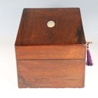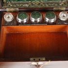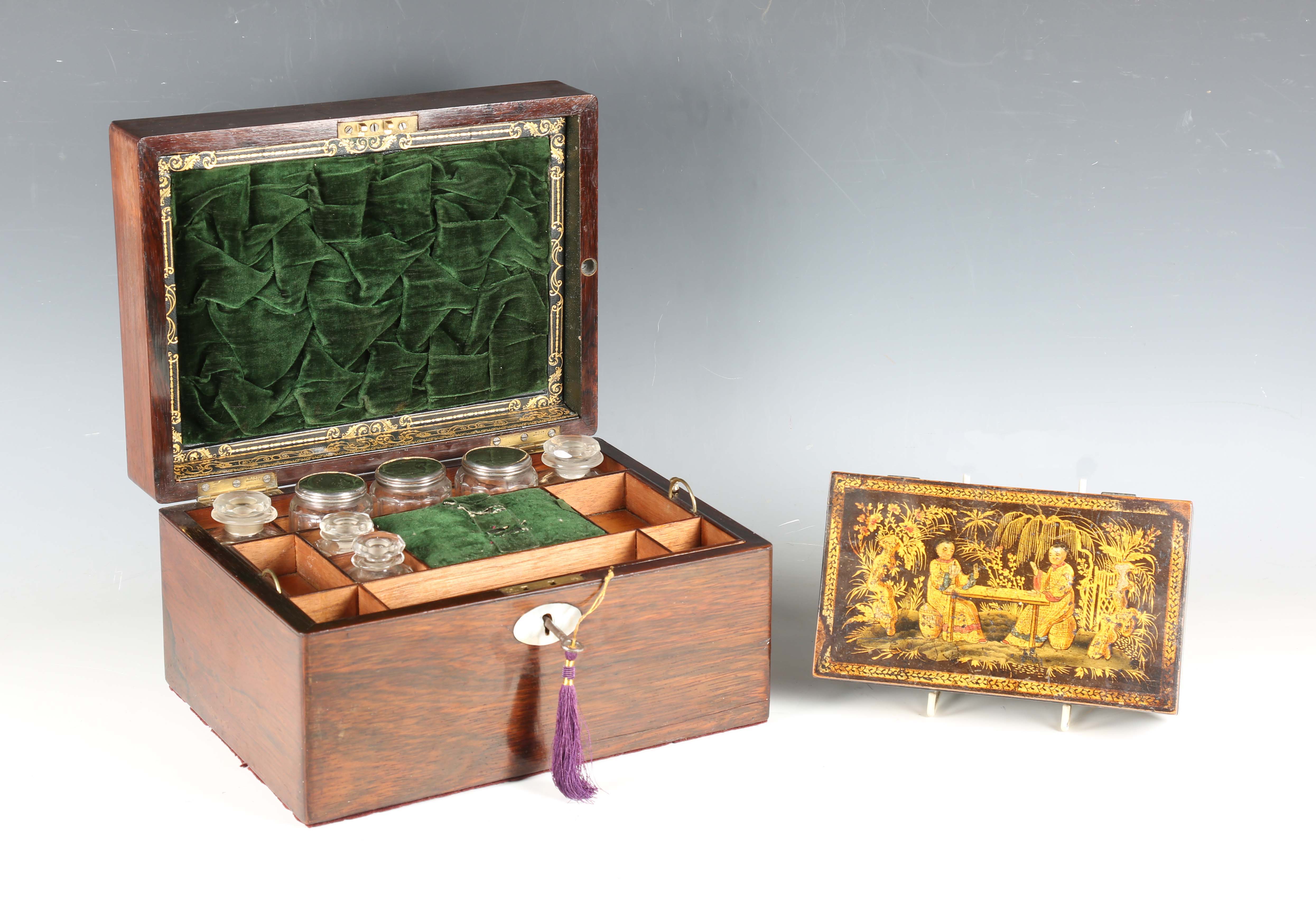 A Victorian rosewood vanity case, the hinged lid enclosing a fitted interior, width 30cm, together with a 19th century chinoiserie box, width 21.5cm.