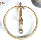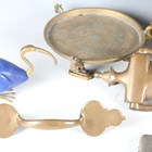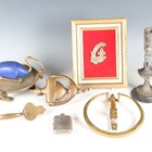 A mixed group of metalware, including a 19th century brass doorknocker of urn form, height 20cm, a 19th century Egyptianesque candlestick, height 25cm, a lapis lazuli and brass model of an ibis and a fragment of medieval metalware, framed.