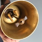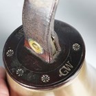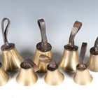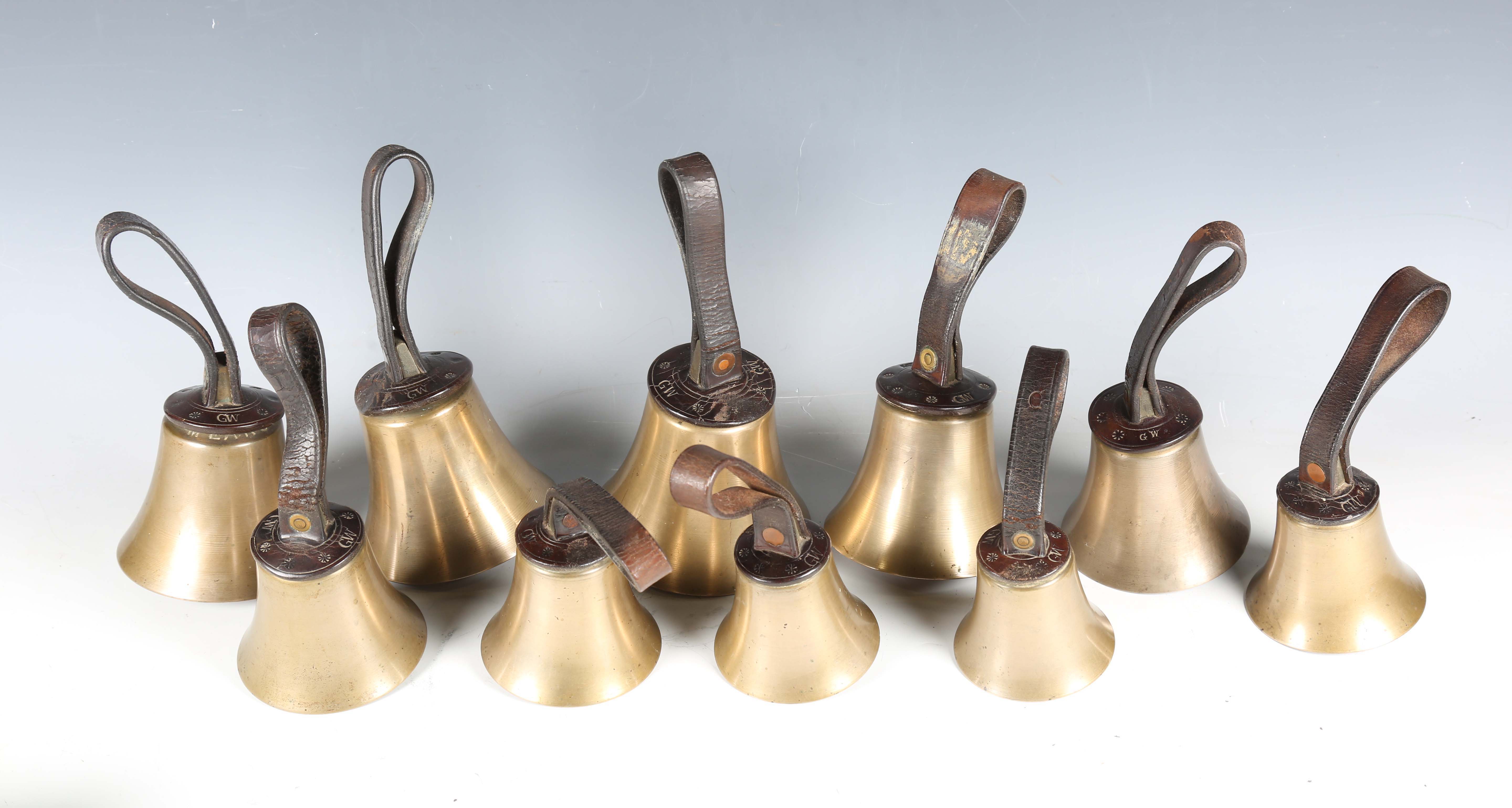 A set of ten musical handbells, each leather mount with tooled initials 'G.W', some bearing tooled notes to straps, diameter of largest bell 13cm.