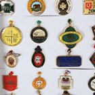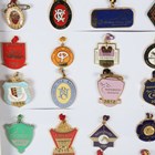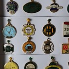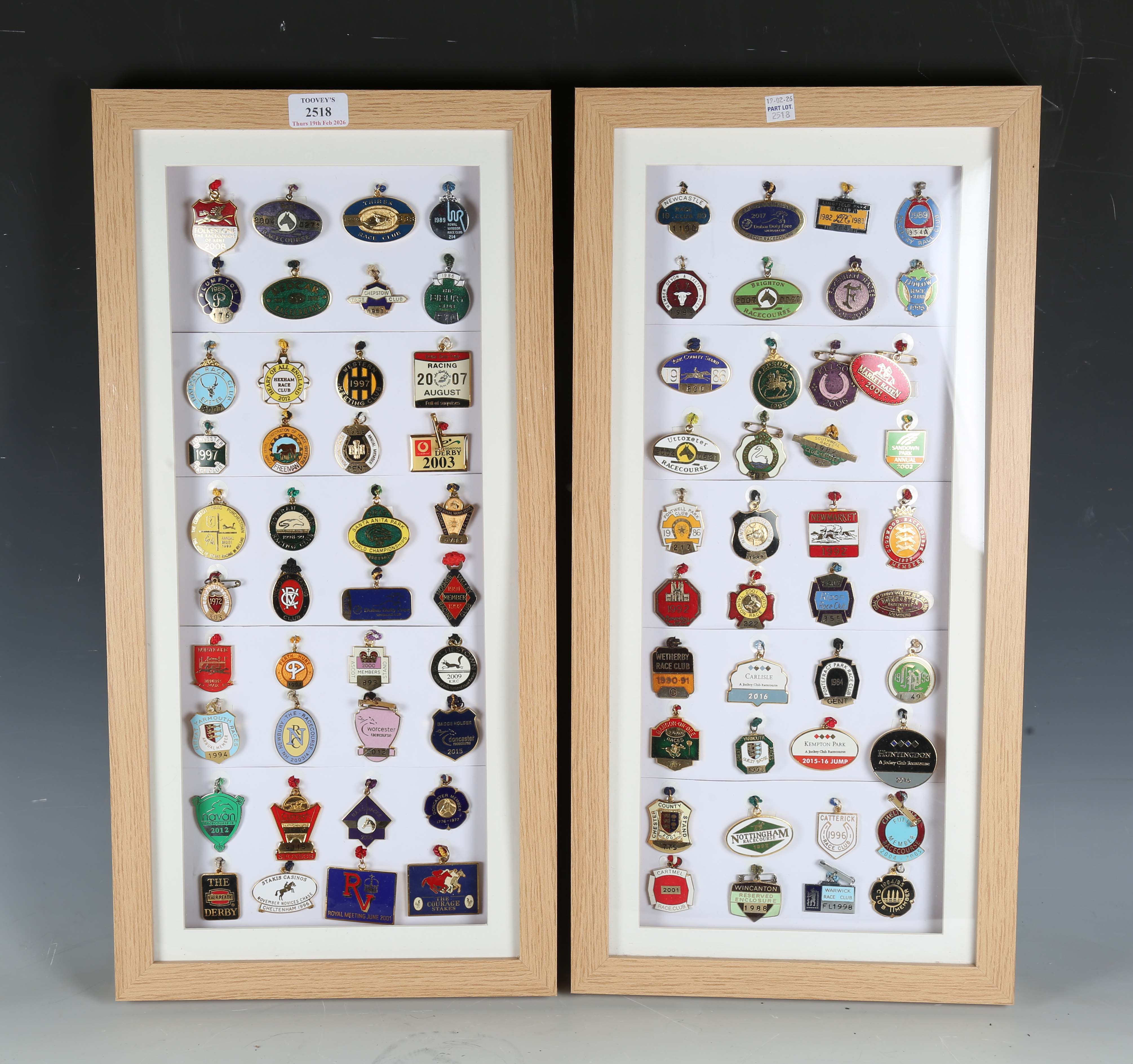 A group of eighty late 20th and early 21st century enamelled horse race meet member and other badges, mounted within two frames.
