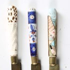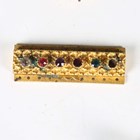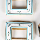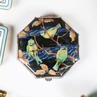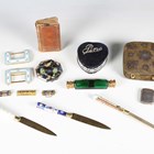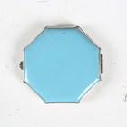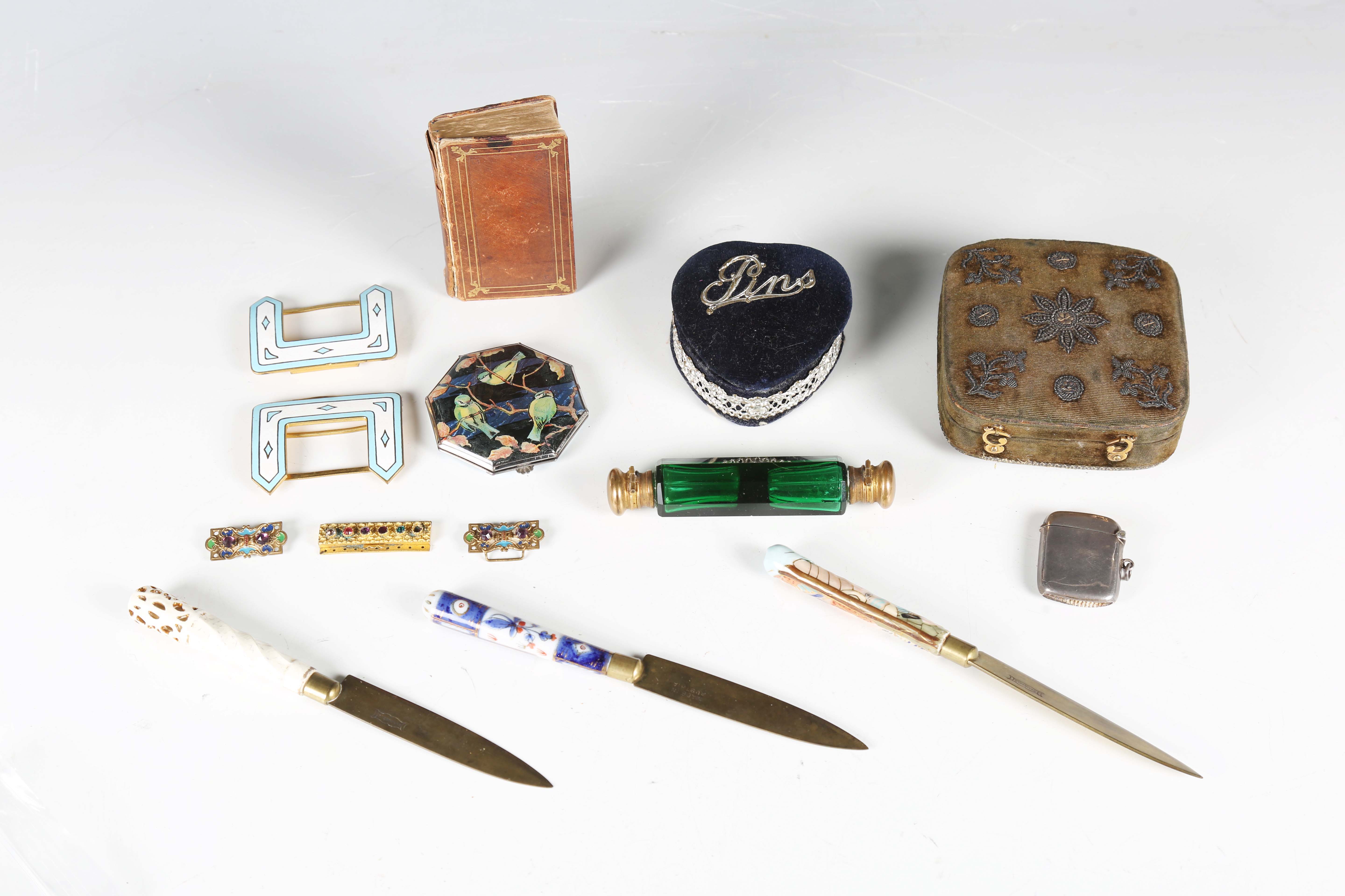 A silver vesta case, detailed ‘London Opera House “Come over here”’, Birmingham 1913, and a group of further collectors' items, including a pale blue and white enamelled two-piece buckle, a smaller paste set two-piece buckle, a lady’s powder compact, a pin cushion box, detailed ‘Pins’ and a brass mounted green glass double-ended scent bottle.