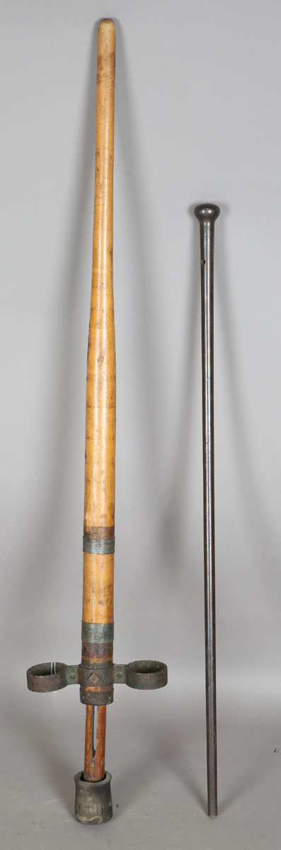 An early 20th century American pogo stick, length 116cm, together with an unusual all-steel walking cane, length 91cm.