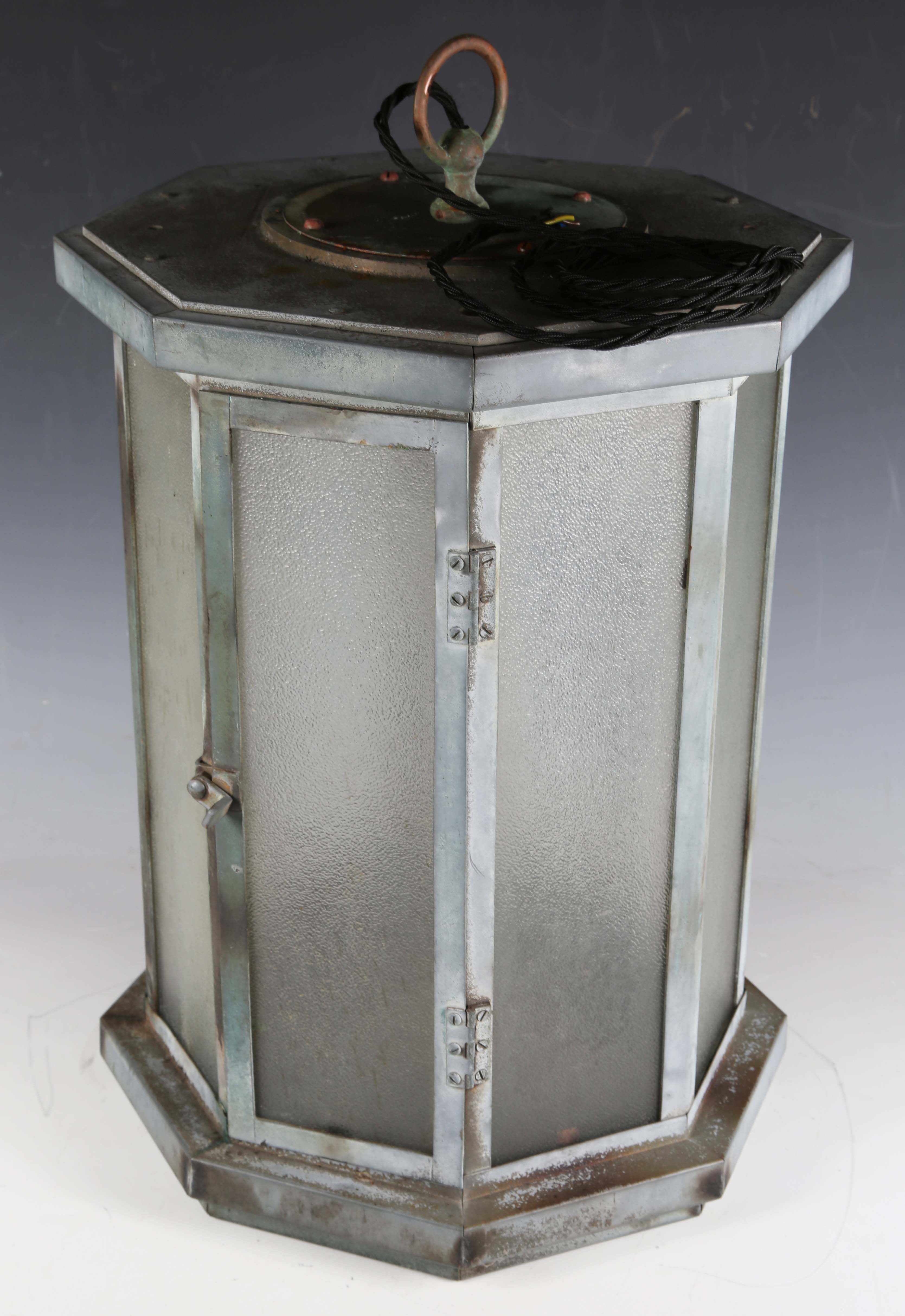 A mid-20th century galvanized copper octagonal hanging lantern, inset with textured glass, height 50cm.