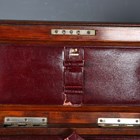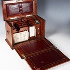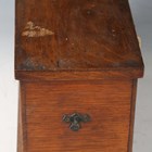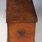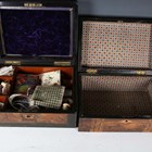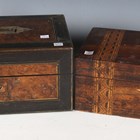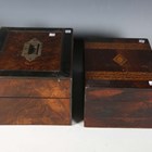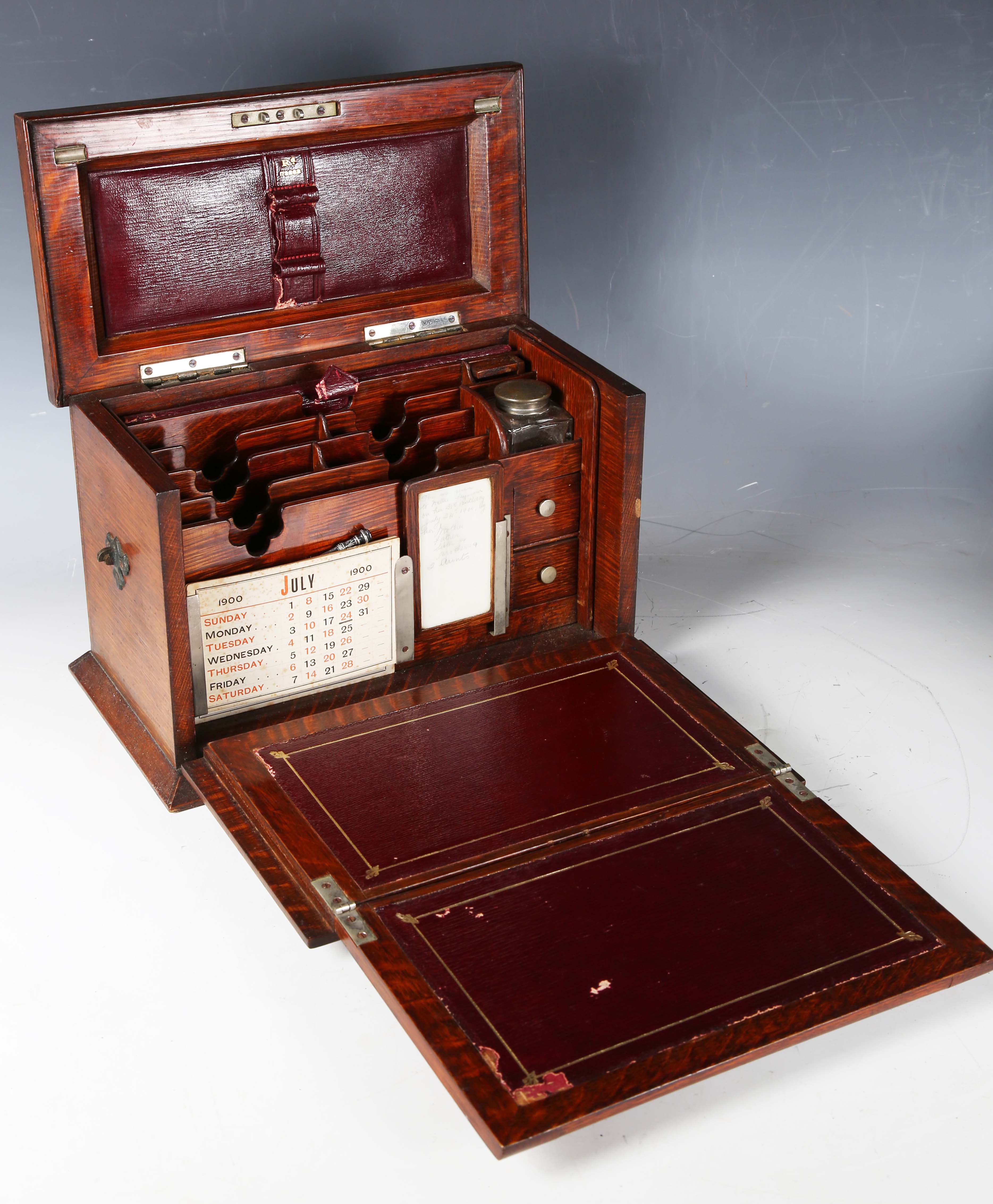 A late Victorian oak writing box, the hinged lid and fall front enclosing a burgundy leather-lined interior, width 31cm, together with two Victorian walnut workboxes.