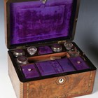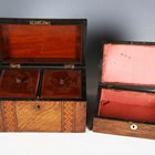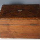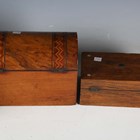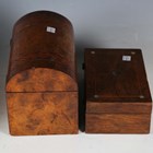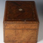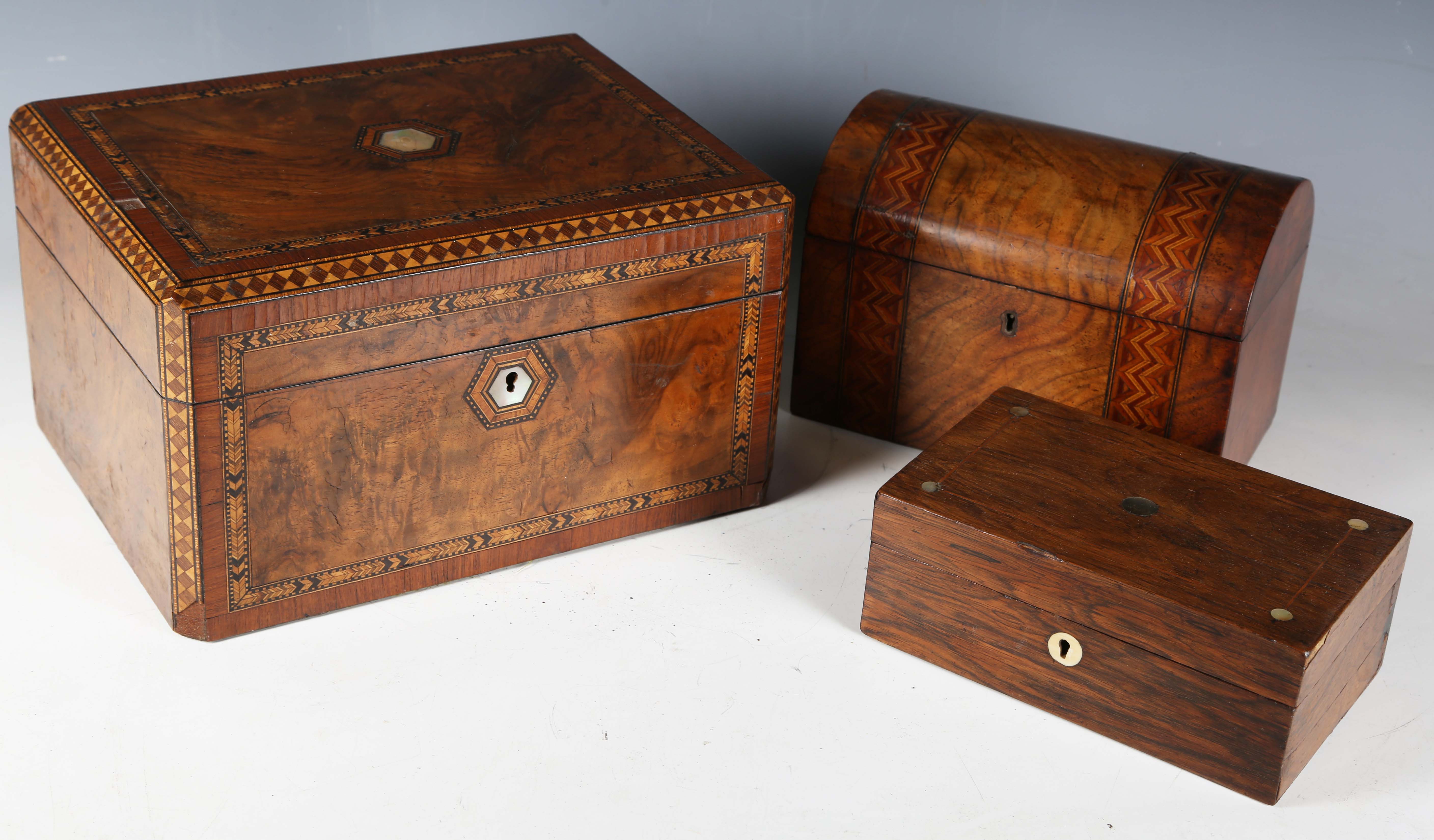 A late Victorian burr walnut and chequer banded vanity case, width 30.5cm, together with a Victorian walnut dome-topped tea caddy and a Victorian rosewood workbox.