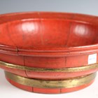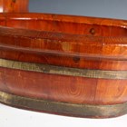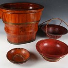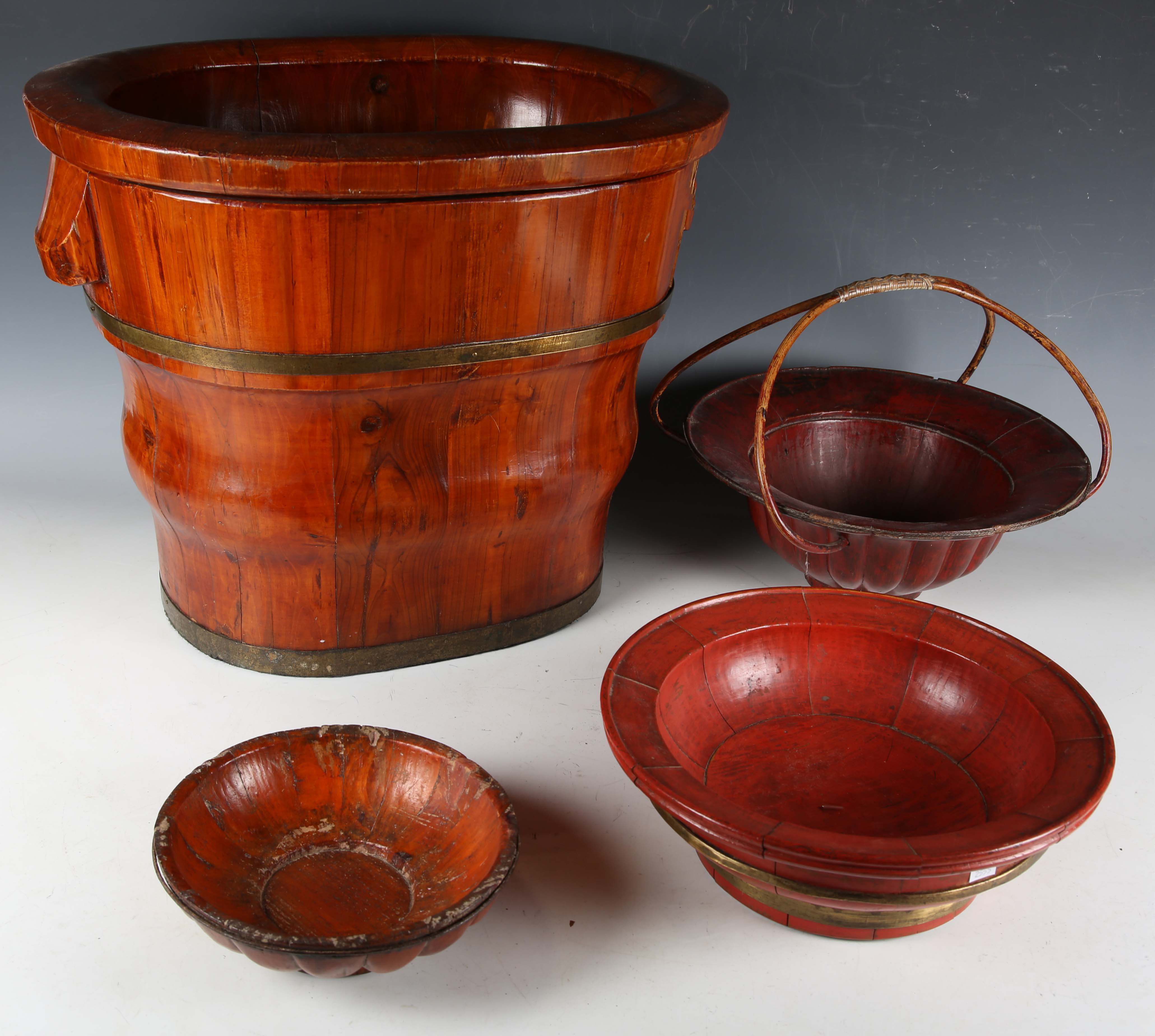 A Chinese softwood coopered bucket and interfitting basin, height 39cm, together with three similar bowls.