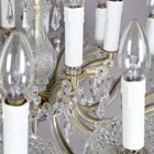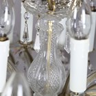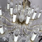 A mid-20th century moulded clear glass and gilt brass twelve-light chandelier, hung with shaped drops, height 40cm, width 60cm.
