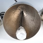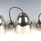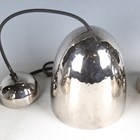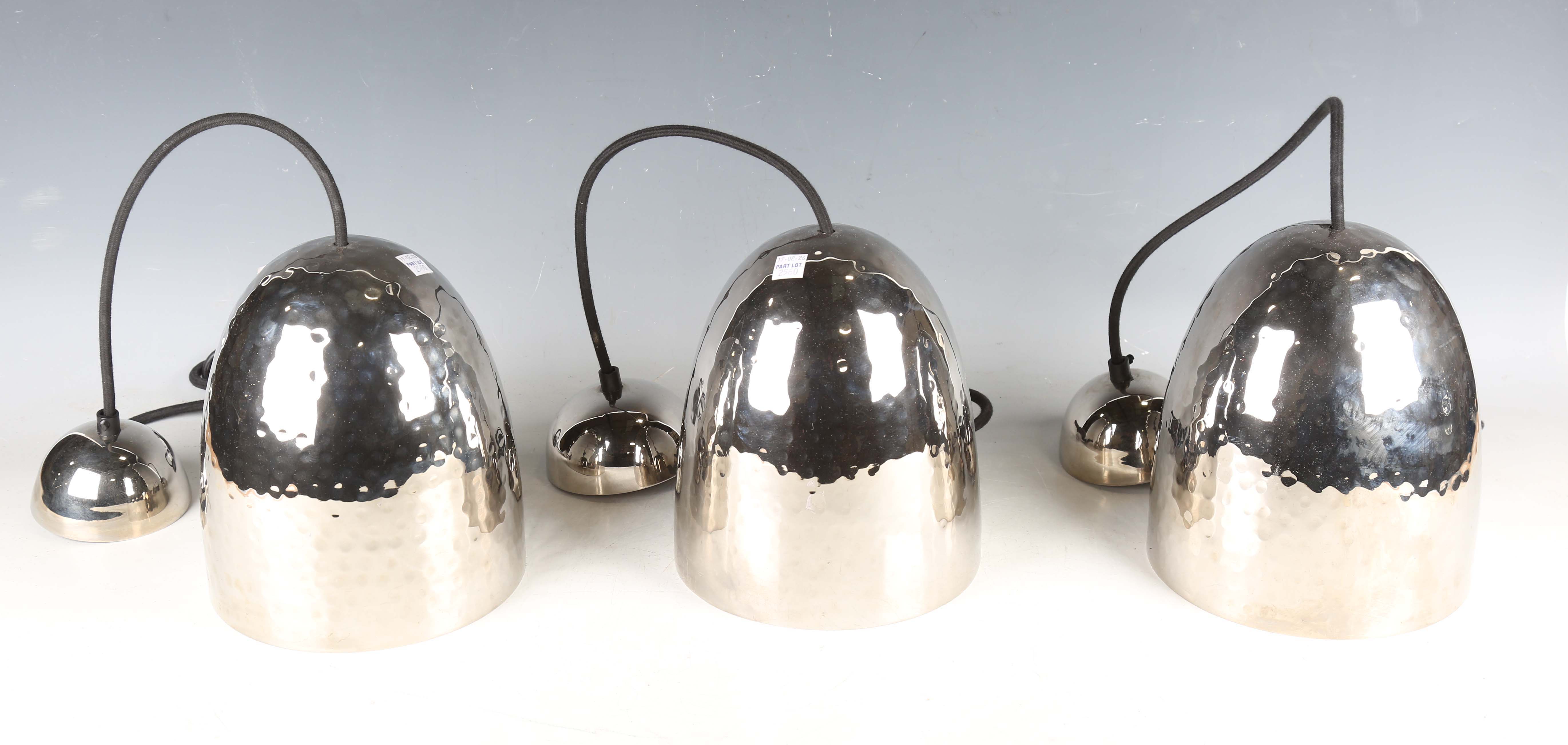 A set of three modern BTC nickel plated hand-spun brass light shades, retailed by Liberty & Co, height 20cm, diameter 18cm, together with light fittings and ceiling roses.