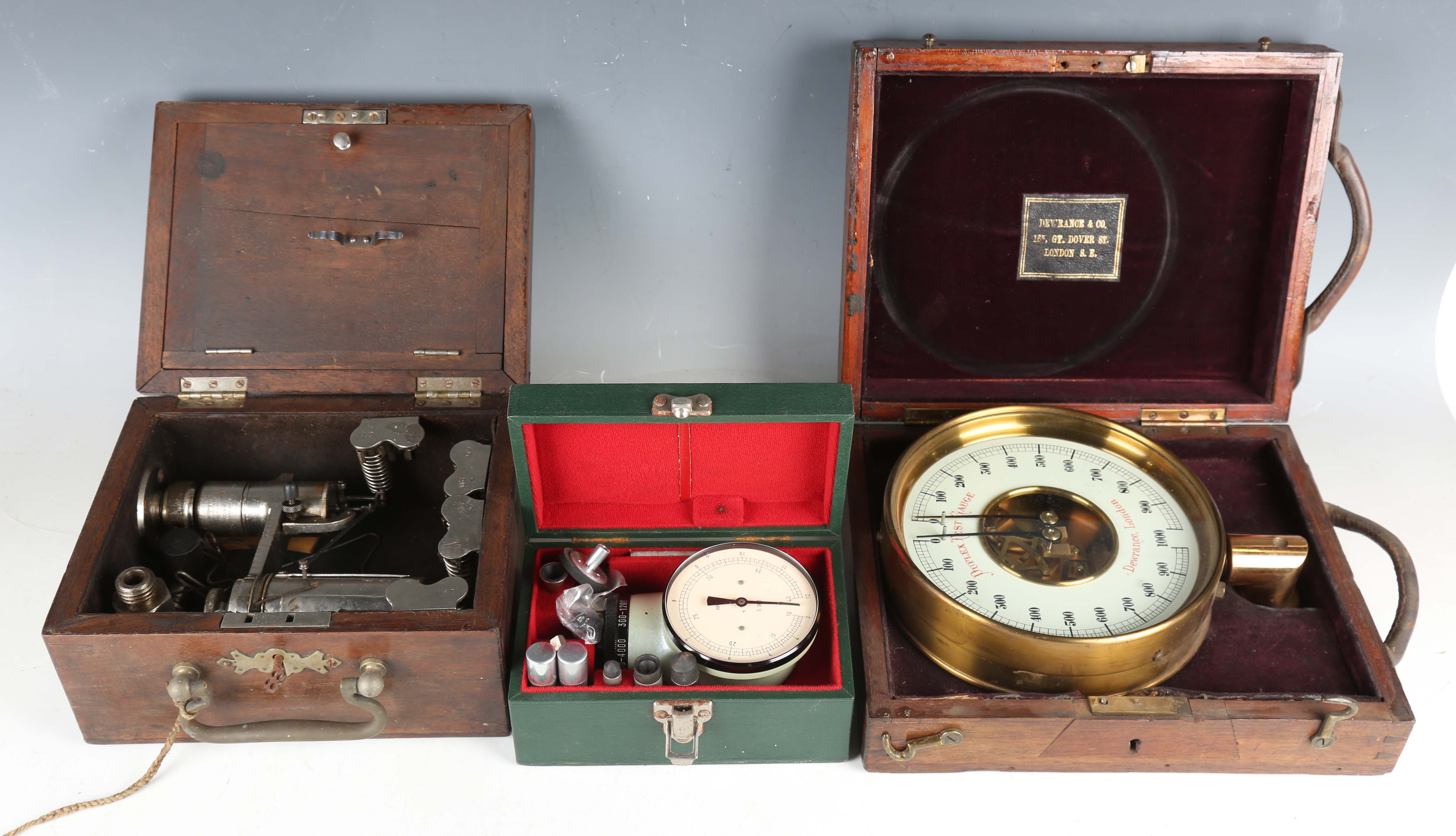 A late 19th century gilt brass test gauge by Dewrance & Co, London, boxed, another boxed gauge and an American Crosby steam gauge, boxed.