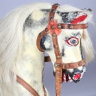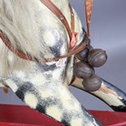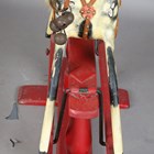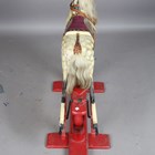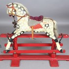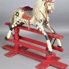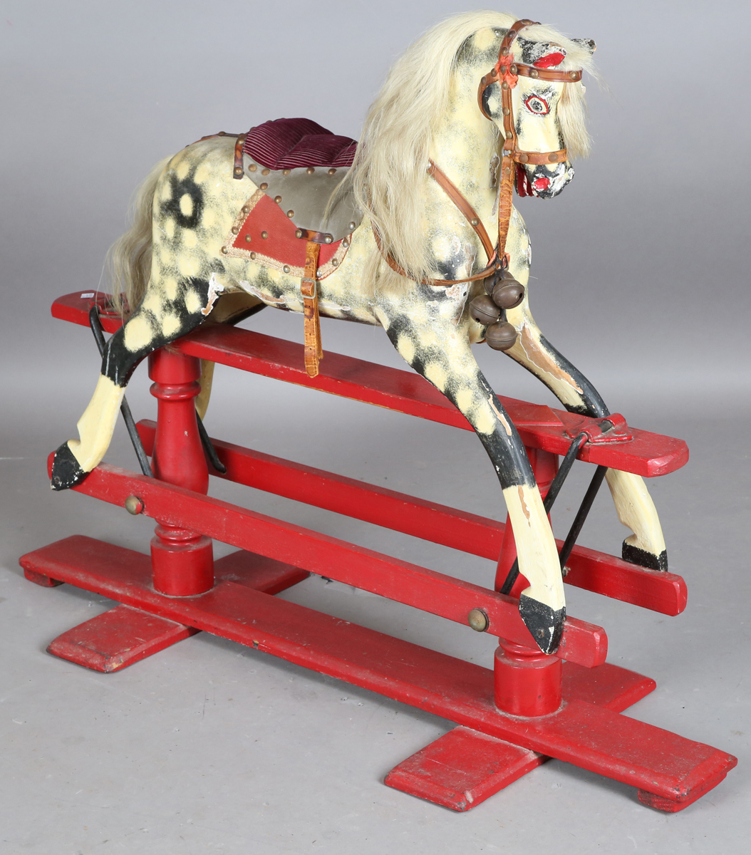 A late 19th/early 20th century carved and painted wooden rocking horse, raised on a trestle style base, height 90cm, length 112cm.