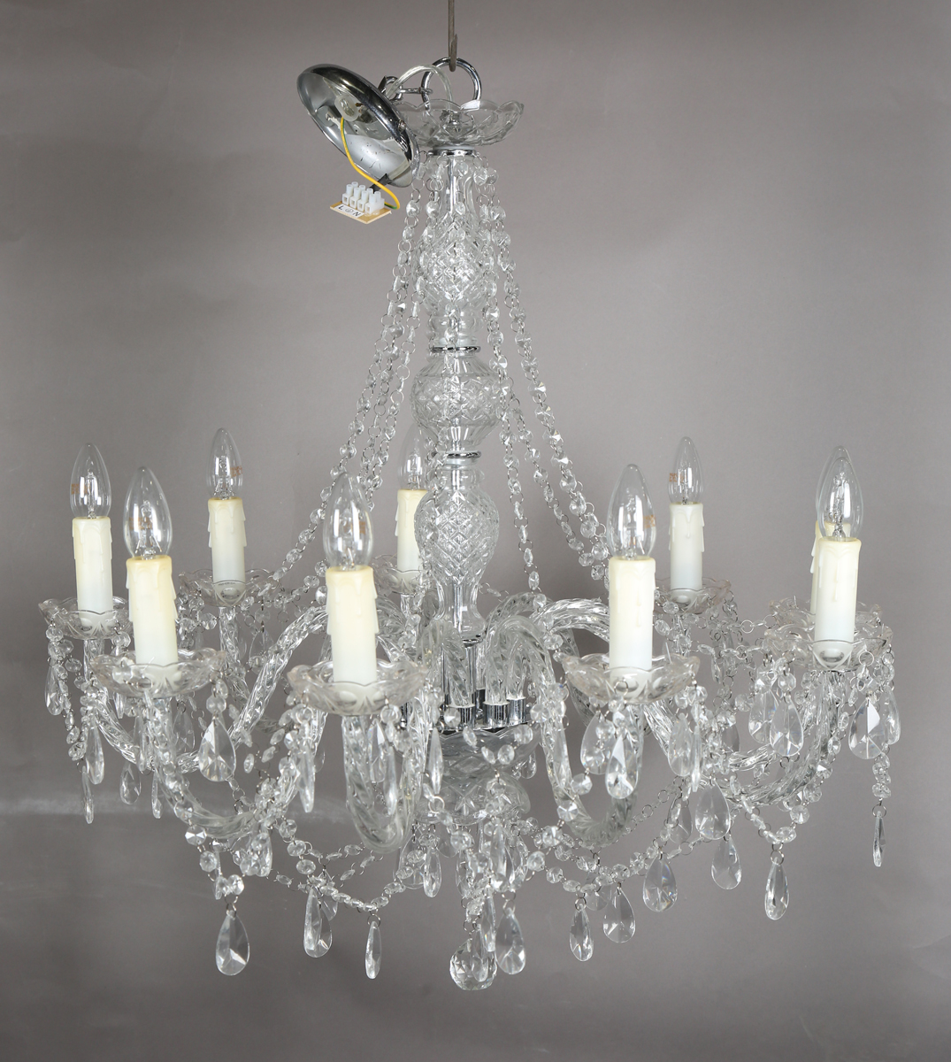 A late 20th century clear glass nine-light chandelier with wrythen branches and shaped drops, height 75cm, width 70cm.