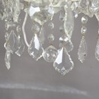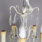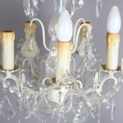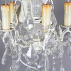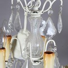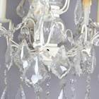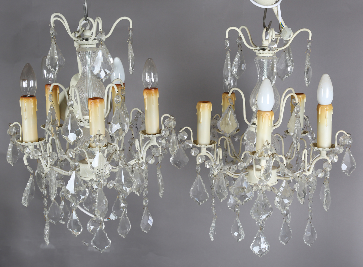 A pair of late 20th century clear glass and cream painted metal six-light chandeliers, hung with bead swags and shaped drops, height 53cm, width 35cm.