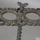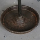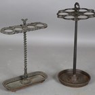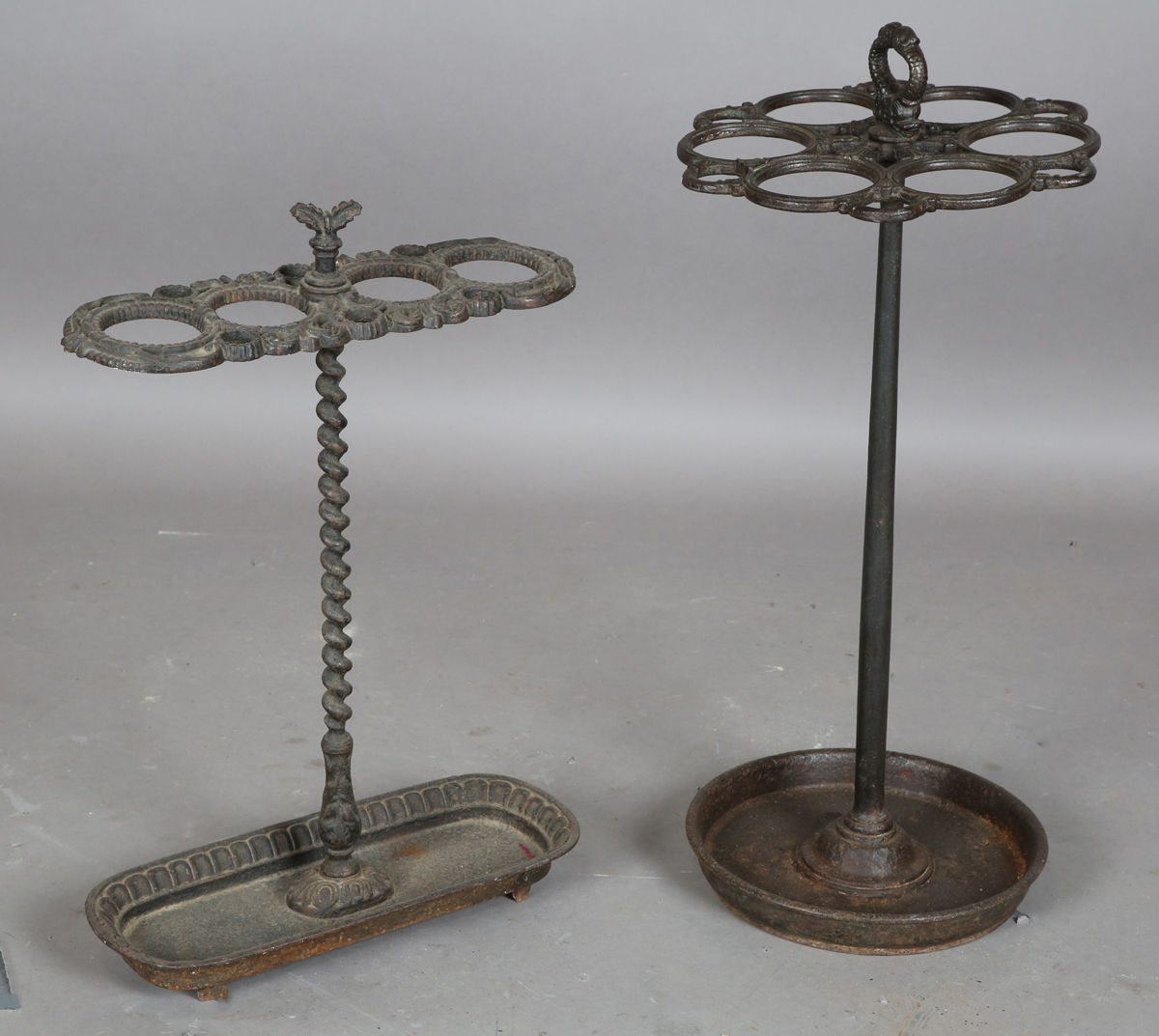 A late 19th century Continental cast iron stickstand with six circular apertures above a drip pan, height 67cm, together with another cast iron stickstand, width 38cm.