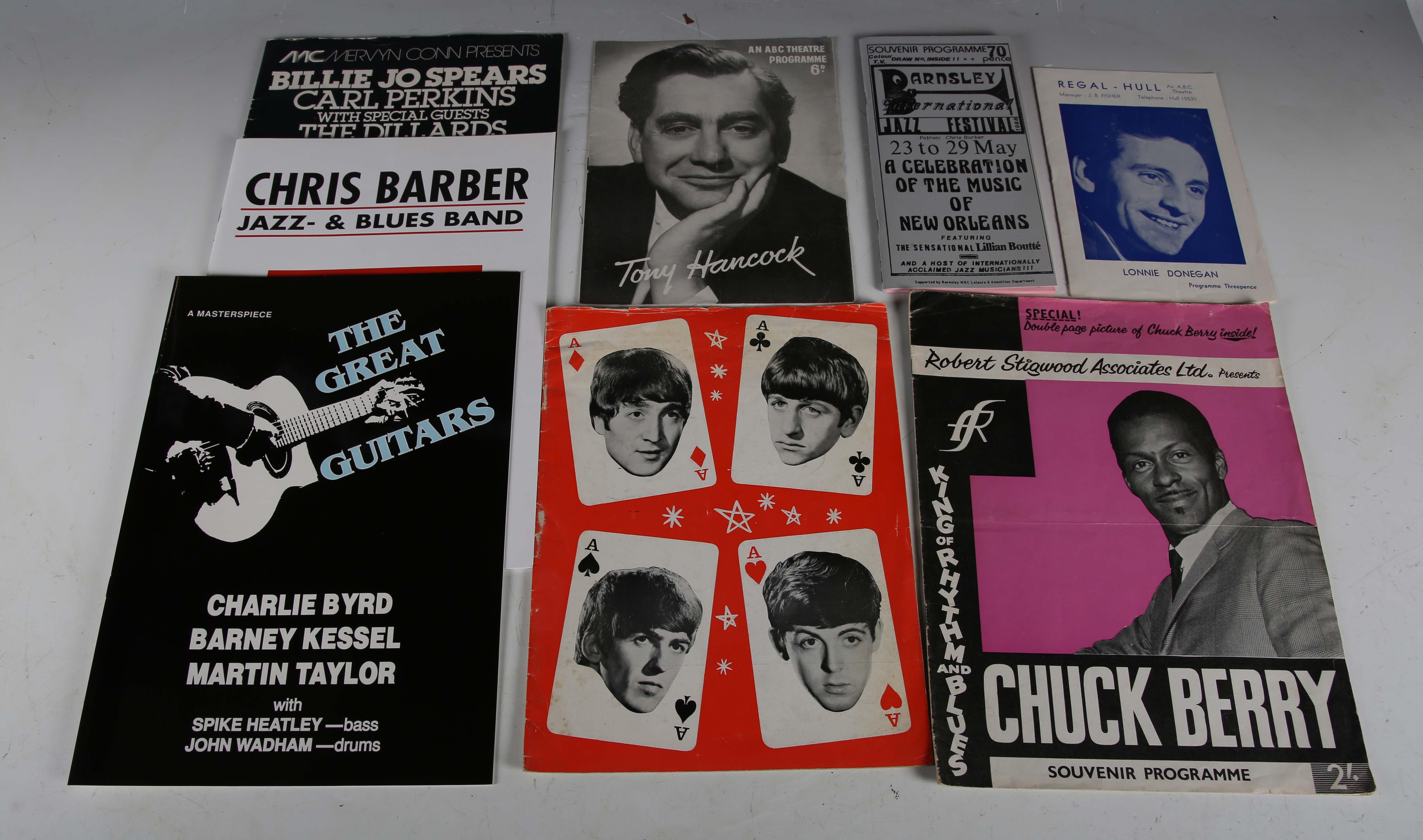 A small collection of music-related ephemera, including a Beatles 1964 tour programme, Chuck Berry, Lonnie Donegan and Tony Hancock programmes, and a quantity of jazz-related material.
