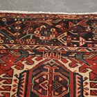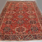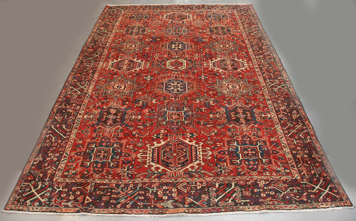 A Karajar carpet, North-west Persia, mid-20th century, the red field with overall hooked palmettes, within a charcoal flowering vine border, 337cm x 240cm.