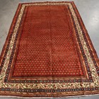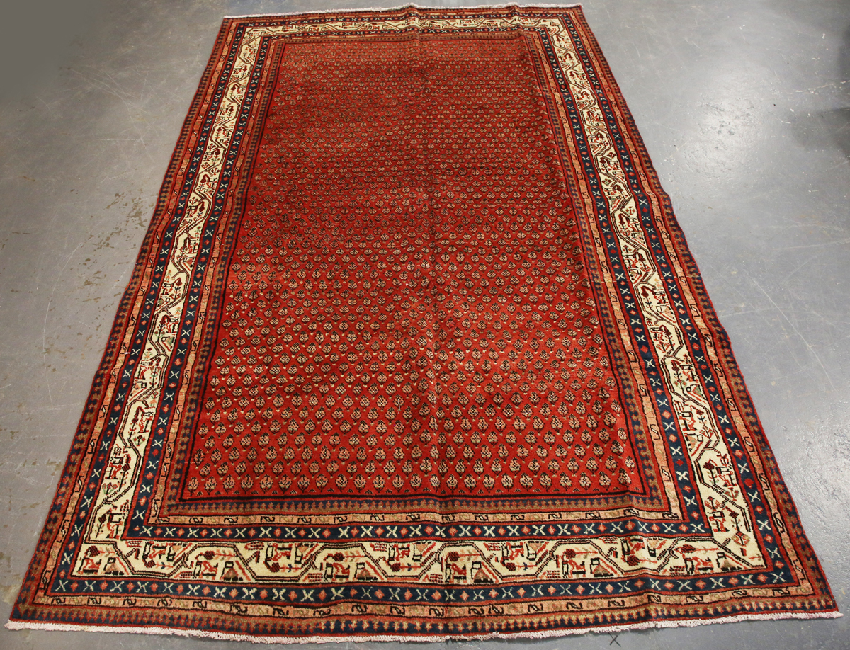 A Serrabend carpet, North-west Persia, mid/late 20th century, the red field with overall offset boteh, within an ivory trailing vine border, 330cm x 206cm.